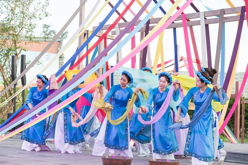 表演中的所有景象、服装、道具都经过精心计算和还原,不仅紧扣历史,而且营造出绚丽、和谐、令人印象深刻的场景。斗笠、织布机等具有浓郁传统和家乡特色的道具,也与灵活的灯光效果相结合,既新颖又充满民族精神。当然,观众一定会被演出的精致和宏伟所折服。