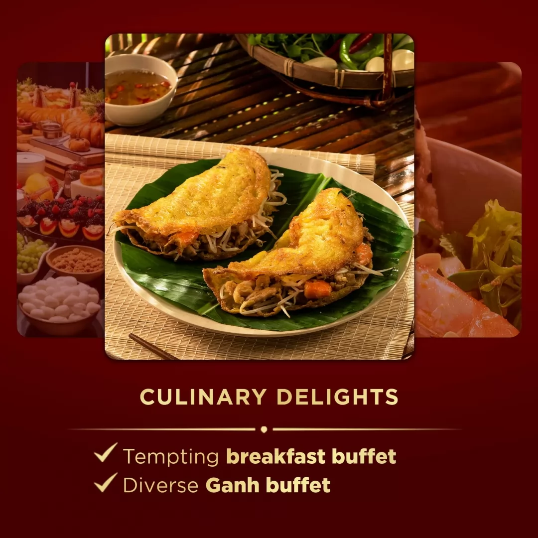 - A Breakfast Buffet at An Bistro and a Buffet Ganh Ticket at Quang Cuisine Zone: Start your day with a diverse menu featuring dishes from Asia to Europe, and in the evening, savor over 36 unique Vietnamese specialties. The culinary delights at Hoi An Memories Land promise an exceptional taste experience found only at the "World’s Leading Cultural and Entertainment Complex."