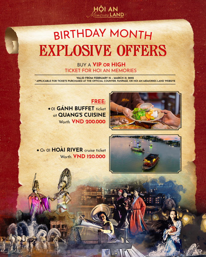 From February 15th to March 31st, 2025, purchase a VIP/HIGH-Class ticket for the new version of Hoi An Memories, you will get an exciting promotion combo of: