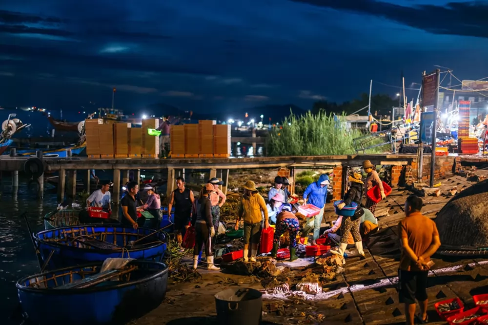 From 4:30 AM to 6:00 AM, this area becomes bustling with hundreds of fishing boats docking after a night of fishing. As the sun rises, the light shines across the Thu Bon River, reflecting on the fresh fish, and the sounds of people calling to each other create a lively yet not noisy scene.