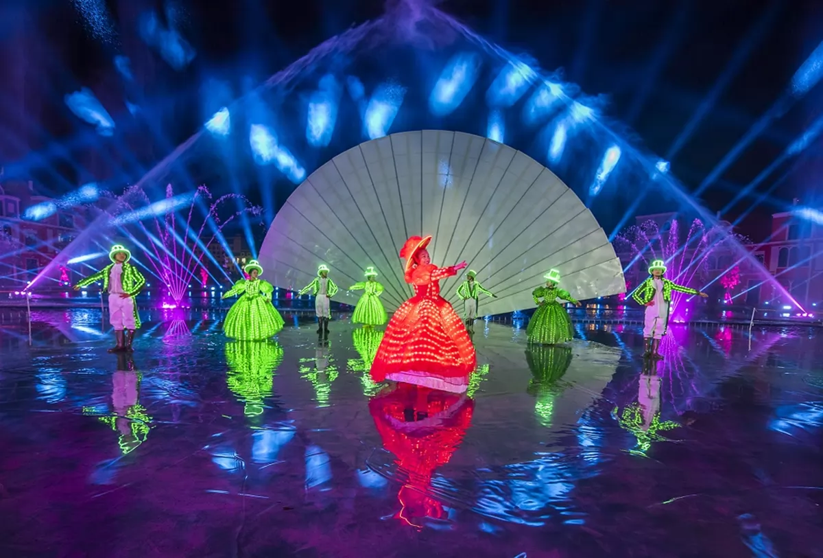 Sitting by the canal in the tropical heat while watching a Venetian masquerade unfold is a surreal, yet delightful experience. The technical execution of the "Lovers' Painting", where a 3D hologram is projected onto a massive fan of sprayed water, is mesmerizing. It feels like a slice of European magic engineered for the tropics, accompanied by lasers, fire effects, and classical music.