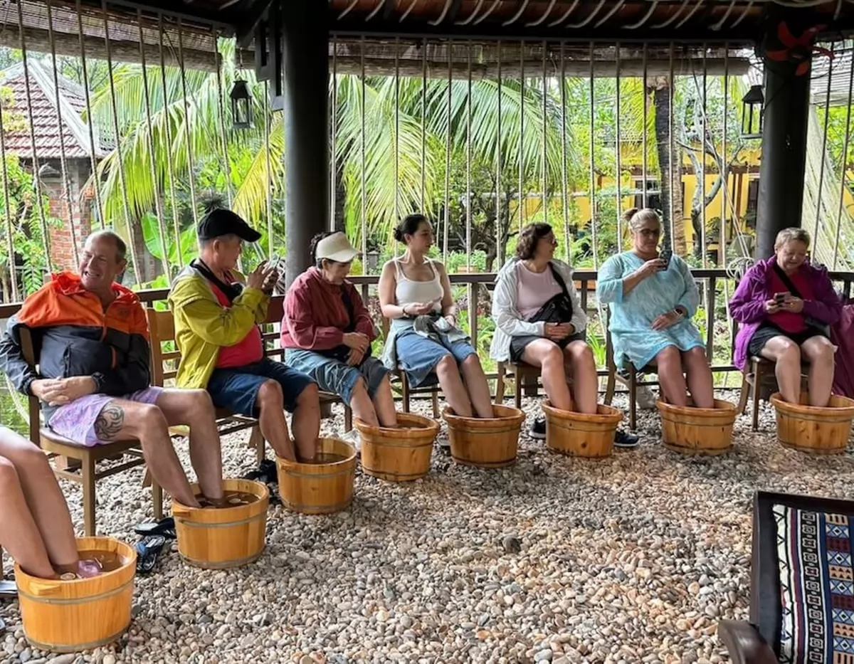 After a morning of farming or cycling, treat yourself to a traditional herbal foot bath. The villagers use a specific blend of medicinal herbs grown in the garden—such as lemongrass, basil, and ginger—boiled in water. Soaking your feet in this warm, fragrant mixture not only relieves fatigue but also provides a deep sense of relaxation for your body and mind.