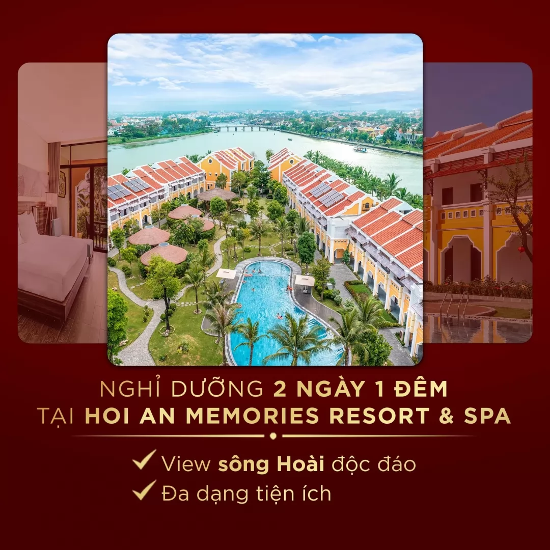 - 2 ngày 1 đêm nghỉ dưỡng tại Hoi An Memories Resort & Spa: Tọa lạc giữa  dòng sông Hoài thơ mộng, toàn bộ phòng của resort đều có view hướng sông. Với không gian thoáng đãng, khuôn viên xanh mát, nơi đây thật thích hợp để du khách thư giãn, tận hưởng trọn vẹn trong suốt kỳ nghỉ tại Hội An.