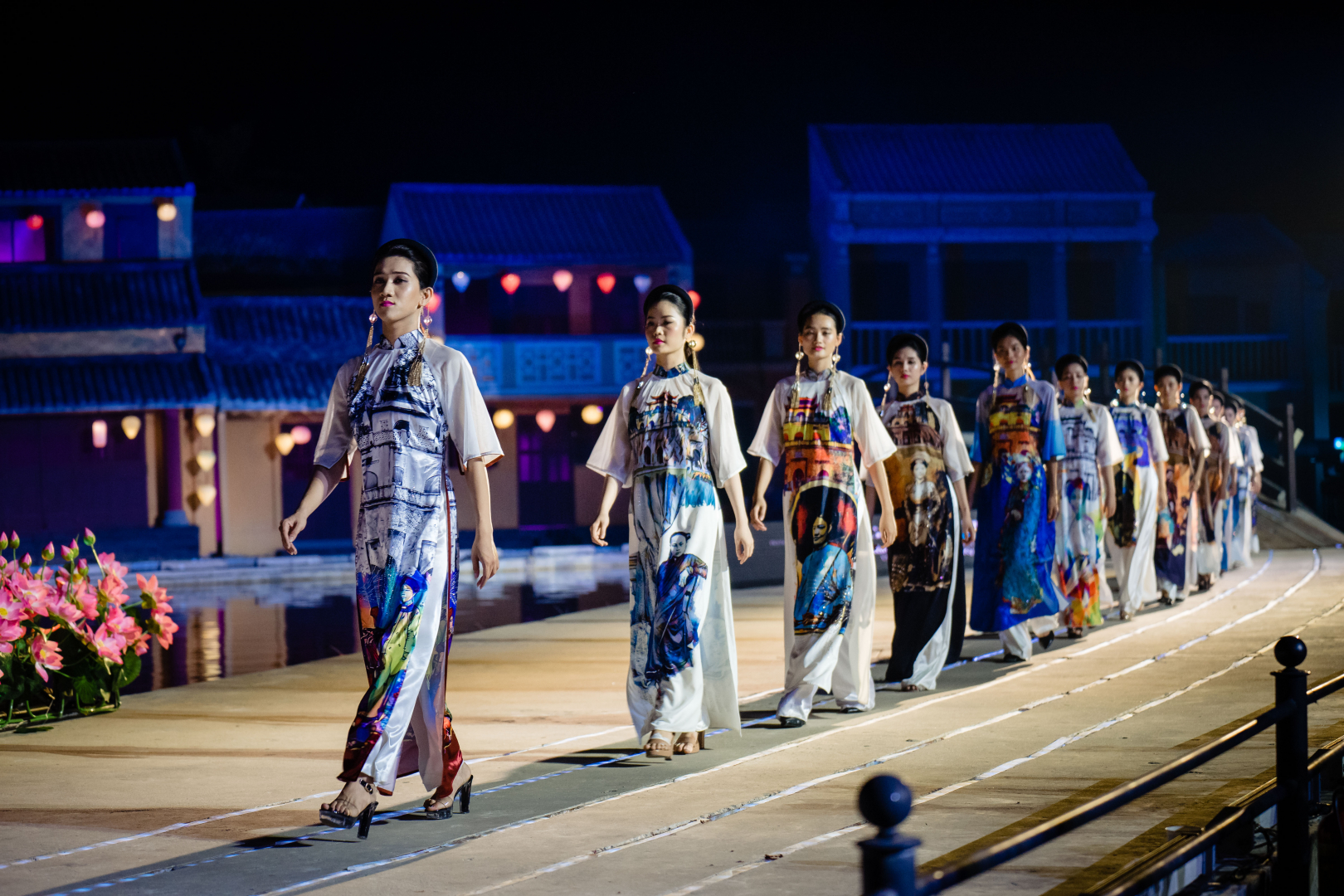 Các người mẫu và diễn viên đang biểu diễn áo dài tại lễ hội. |