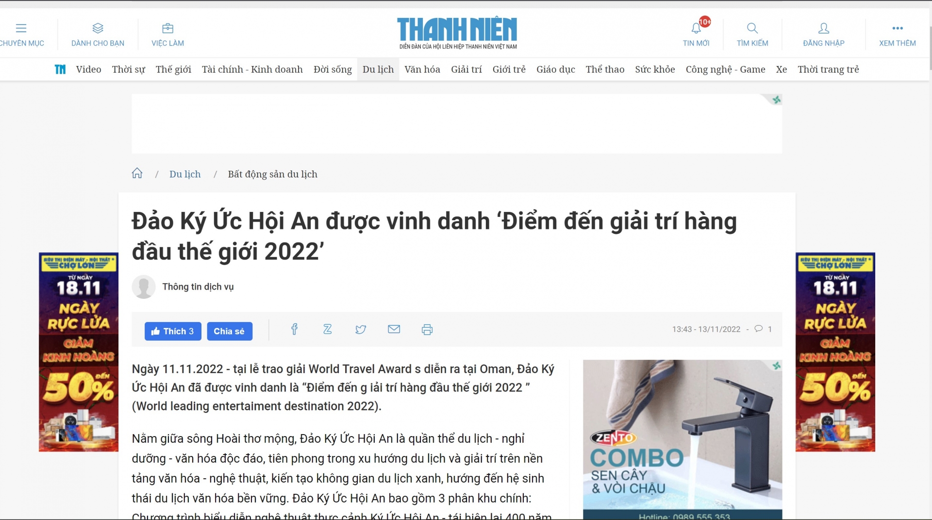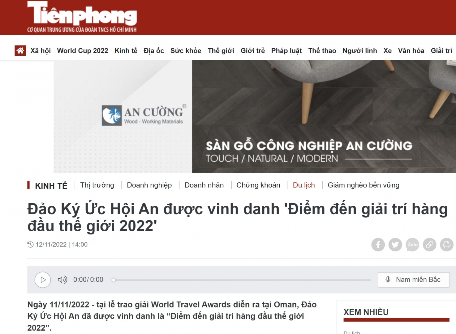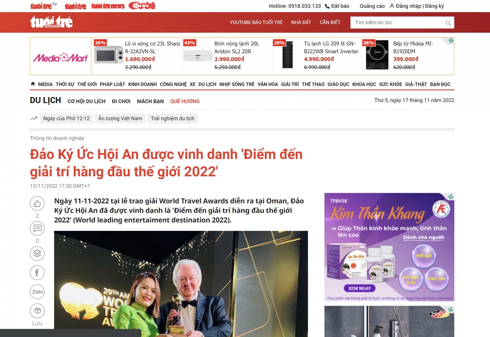 Hàng loạt trang báo đưa tin về sự kiện Đảo Ký Ức Hội An được vinh danh là "Điểm đến giải trí hàng đầu thế giới"