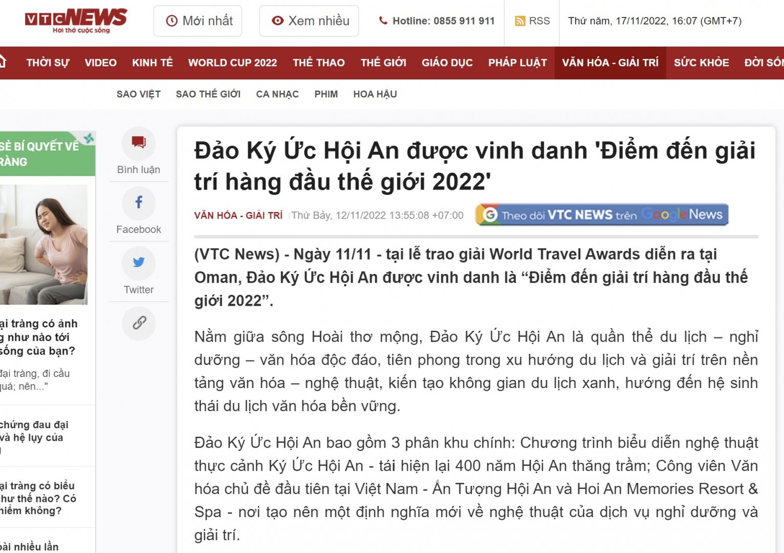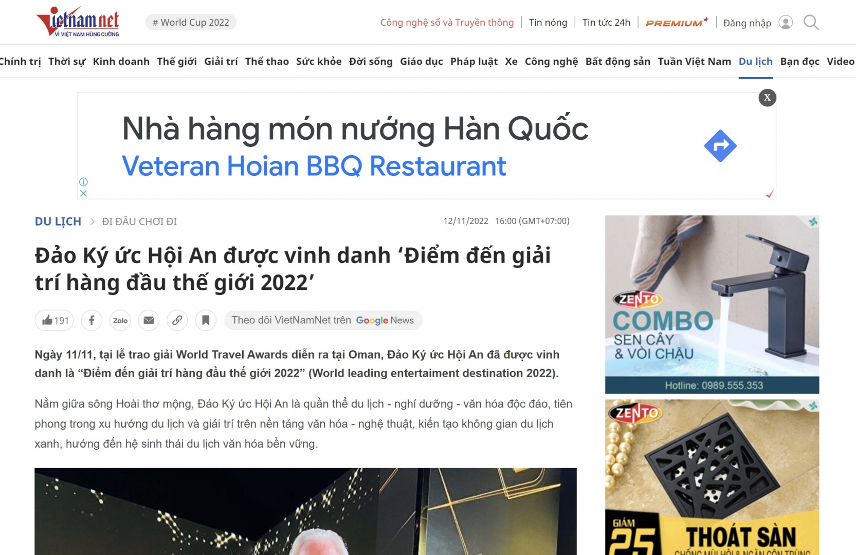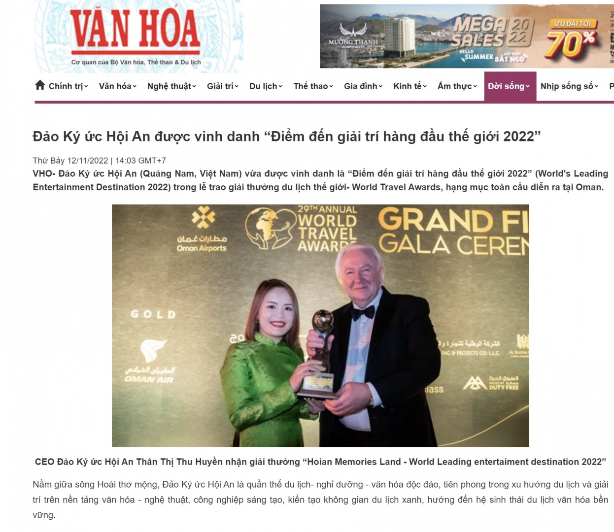 Vietnamnet.vn dẫn tin sự kiện Đảo Ký Ức Hội An được vinh danh "Điểm đến giải trí hàng đầu thế giới". Tham khảo tại: https://vietnamnet.vn/dao-ky-uc-hoi-an-duoc-vinh-danh-diem-den-giai-tri-hang-dau-the-gioi-2022-2079906.html