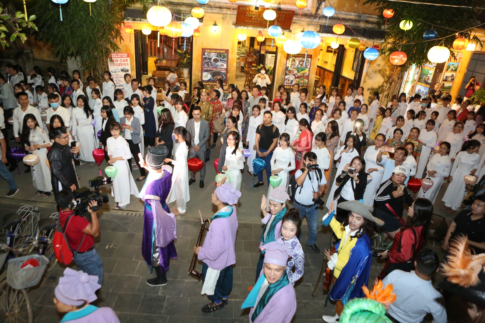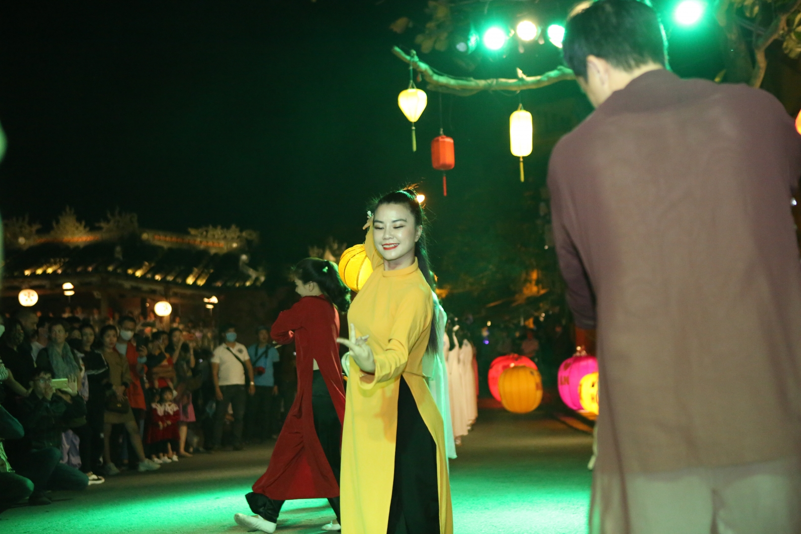Trước đó từ chiều, đồng loạt đèn lồng sẽ được bật lên để làm nghi thức thắp sáng phố cổ, mời gọi mọi người dân và du khách cùng ra đường. Tới xem nghệ thuật thực cảnh "Ký Ức Hội An" trình diễn tại phố cổ có nhiều gia đình người nước ngoài cũng đã mặc áo dài, khăn đóng, cầm đèn lồng để nối dài dòng người, như góp phần mang lại cho phố sinh khí mới chào đón năm mới 2021 đầy hân hoan ở chốn Hội An thơ mộng.