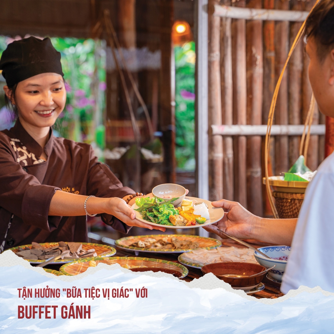Tại Buffet Gánh, du khách sẽ được thưởng thức hơn 36 món ngon chuẩn vị miền Trung. Không gian được bày trí như một phiên chợ xưa, mở ra một hành trình khám phá ẩm thực thú vị.