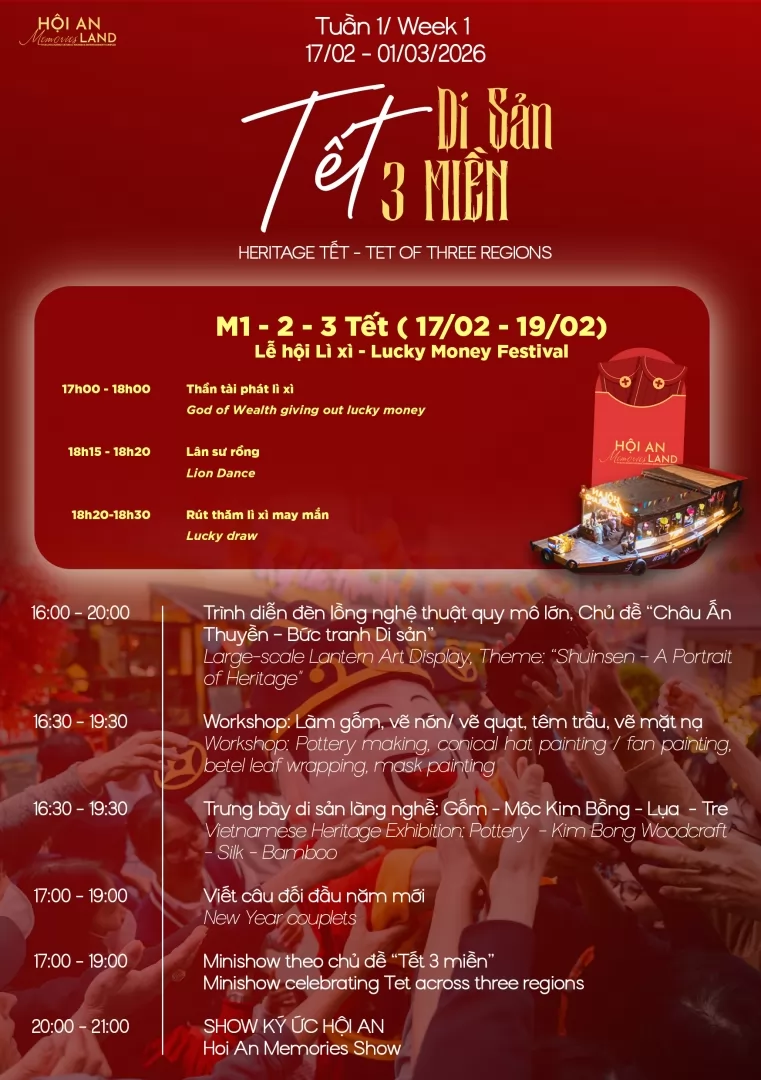 Từ sắc xuân rộn ràng của miền Bắc, nét dung dị ấm áp của miền Trung đến không khí phóng khoáng, tươi vui của miền Nam, mỗi trải nghiệm tại Tết Di Sản đều gợi nhớ về Tết xưa sum vầy, đoàn viên và một khởi đầu may mắn được trân trọng gìn giữ giữa không gian di sản Hội An.