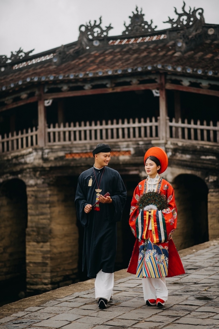 Với bối cảnh nhuốm màu thời gian, các concept vintage và Việt Phục rất được ưa chuộng. Áo dài truyền thống là lựa chọn hàng đầu, tôn lên vẻ đẹp dịu dàng và thanh lịch của cô dâu, đặc biệt khi kết hợp cùng các phụ kiện như nón lá, quạt hoa. Bên cạnh đó, bạn cũng có thể chọn những chiếc váy cưới tối giản, nhẹ nhàng để nổi bật giữa không gian phố cổ.