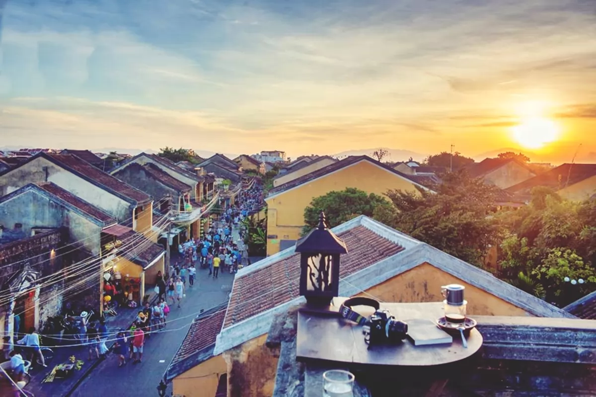 Nếu bạn muốn vừa ngắm hoàng hôn, vừa có những khung hình “check-in” đặc trưng phố cổ, thì các quán café rooftop chính là lựa chọn hoàn hảo. Từ trên cao, mái ngói vàng nâu, dòng sông Hoài và ánh chiều tà tạo nên bức tranh rất riêng của Hội An.