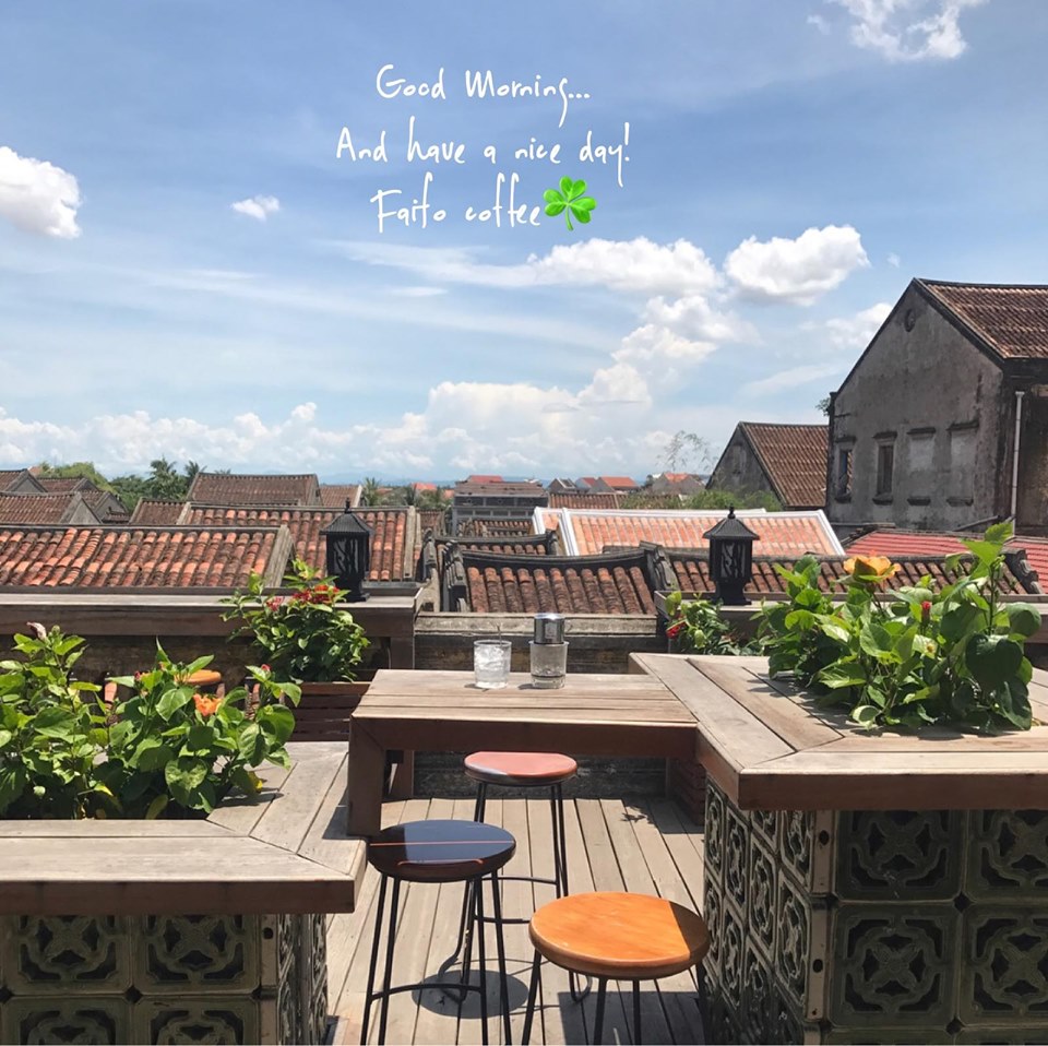 Đón bình minh ở phố cổ là một khoảnh khắc không thể bỏ lỡ của bạn khi đến với Hội An. Khi mặt trời vừa lên, ánh nắng xuyên qua từng kẻ lá cũng là lúc những ngôi nhà cổ “thức giấc”. Không gian trong lành và yên bình của buổi sáng Phố Hội sẽ giúp tâm hồn bạn trở nên tươi mới hơn. Ngồi nhâm nhi ly cà phê Chùa Cầu, hít một hơi thật sâu để cảm nhận nguồn năng lượng tích cực nơi này. Người dân gọi đây là quán Cà phê Chùa Cầu, vì nó nằm ngay vòng cung trước Chùa Cầu (hướng nhìn ra sông Hoài). Giá 1 ly cà phê là 10 nghìn đồng nhưng view thì 1000 tỷ nha các bạn ơi.